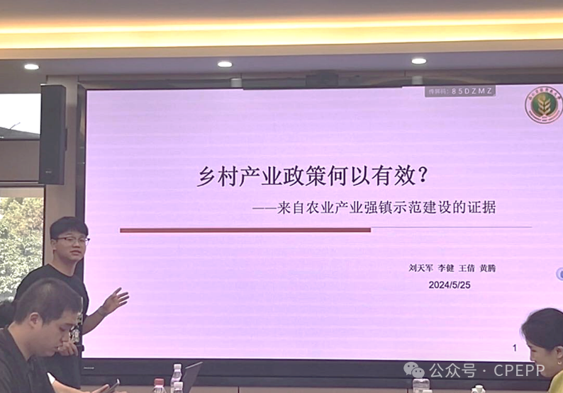 西北农林科技大学经管学院李健硕士生汇报了《乡村产业政策何以有效?——来自农业产业强镇示范建设的证据》一文,文章利用标准双重差分方法评估农业产业强镇政策有效性,提出农业产业强镇示范选点主要通过强化土地和技术要素投入,推动了四种形式(延伸式、嵌入式、替代式、溢出式)的产业振兴路径。此外,该政策具有空间溢出效应,能够推动周边城镇的经济协同增长。
