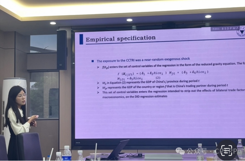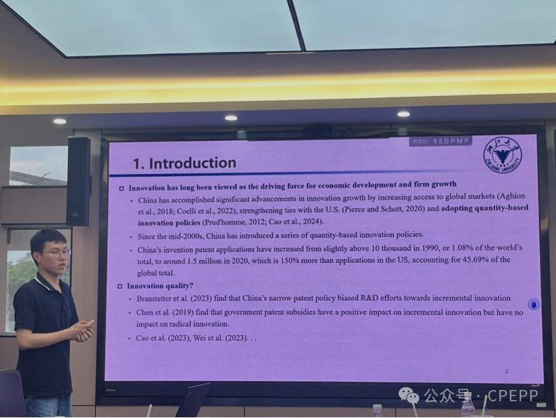 浙江大学公共管理学院陈泽博士生汇报了《Response and adaption of innovation behaviors to trade war: Evidence from Chinese firms》一文,文章以2018年中美贸易战作为研究背景,提出中美贸易战对企业产品出口的制裁会推动企业加大创新力度,尤其是渐进式创新。在机制识别方面,贸易战会增加企业对贸易不确定性和风险的感知,降低经营收入,增加经营成本从而推动渐进式创新。