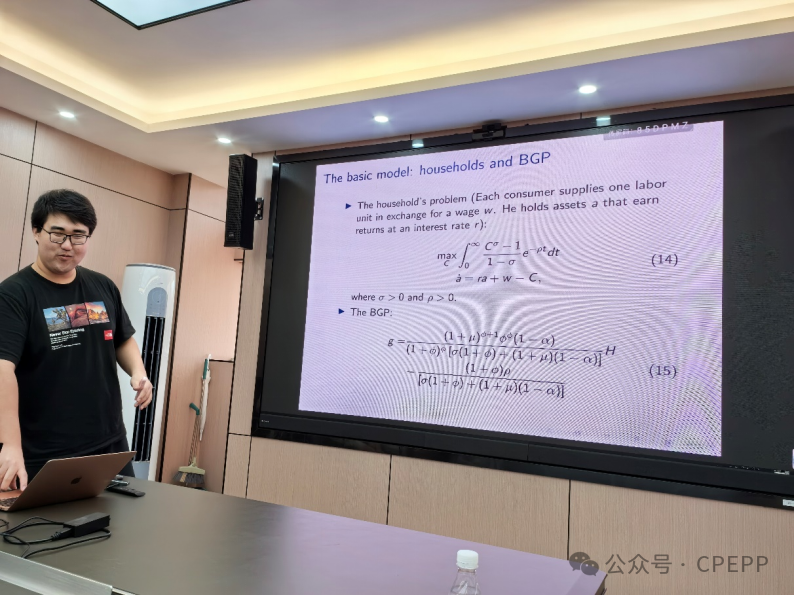 重庆大学公共管理学院姚钦洋博士生汇报了《Knowledge-intensive Business Services, Innovation, and Economic Growth》一文,通过构建包含知识密集型产业(KIBS)、创新者(innovator)、中间产品(intermediate - goods)和最终产品(final product)四部门研发模式的知识密集型服务业内生增长模型,为研究研发与知识管理的融合提供了数字经济背景下的理论依据并以ChatGPT的发布为例实证表明KIBS在知识创新过程中的重要作用。