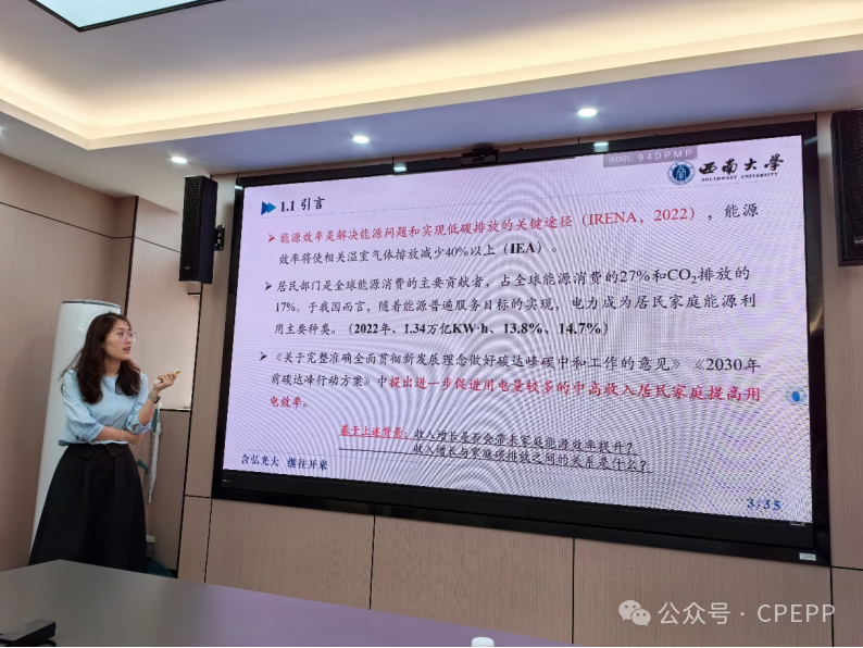 西南大学经济管理学院牛靖博士生汇报了《中国存在家庭能源效率悖论吗?——兼论绿色能源阶梯理论的构建》一文,利用2010-2020年5轮CFPS调查数据和国家统计局公布的能源消费等数据探讨了家庭收入对能源效率的影响,认为家庭收入与能源效率存在反向关系,收入增长通过降低家庭的电价敏感度、提高家庭的舒适度需求,带来了更高的能源消耗。另外,文章还考察了家庭收入与碳排放的关系及其机制,发现收入增长能促进家庭能源阶梯的攀升,进而增加碳排放。