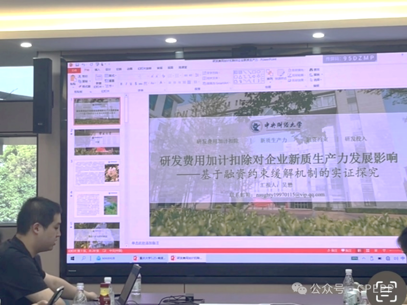 中央财经大学财税学院吴懋博士生汇报了《研发费用加计扣除对企业新质生产力发展影响——基于融资约束缓解机制的实证研究》一文,从劳动者、劳动对象和劳动资料维度构建新质生产力指标体系,采用广义双重差分方法探讨了2013年研发费用加计扣除政策的全国推广对企业新质生产力发展的影响,认为此政策能通过缓解企业融资约束的途径促进新质生产力发展。